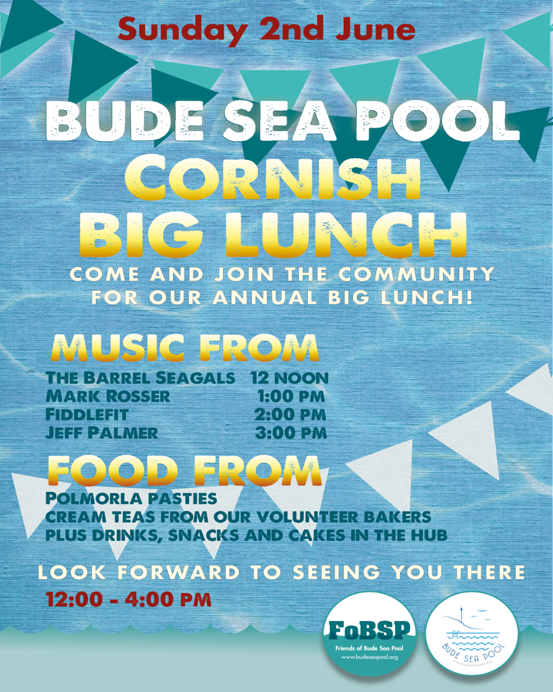 June 2, 2024 @ 12:00 - 16:00 Big Lunch Bude Sea Pool Bude Sea Pool, Bude Come and join the community for our annual Big Lunch. We have food from Polmorla Pasties, cream teas from our Volunteer bakers plus drinks, cakes...